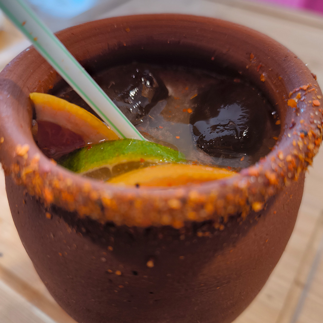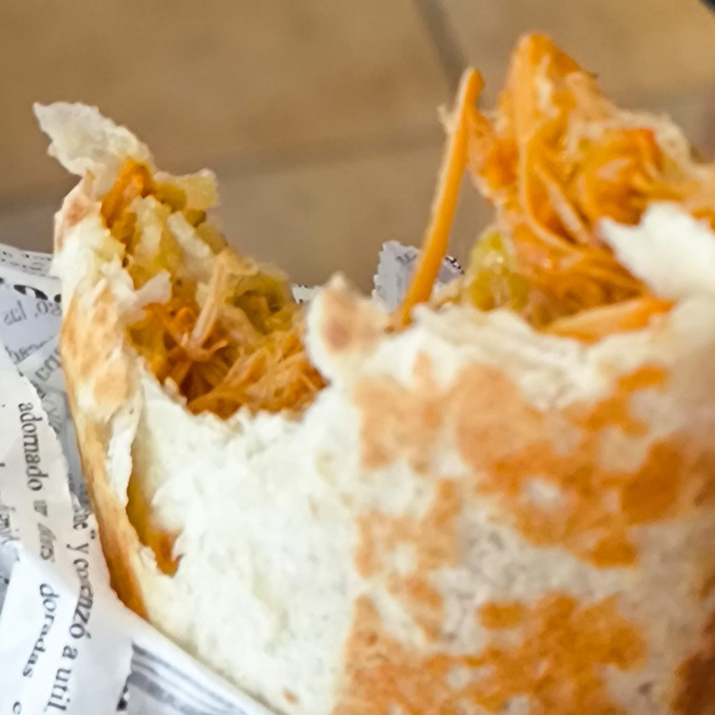 Tortilla de harina de trigo de 30cm enrollada, untada con una pasta de frijoles (alubias) con chile guajillo (no picante) queso mozarella y con alguno de de nuestros 4 rellenos (proteína) a escoger: Carnitas, Cochinita Pibil, Tinga Poblana ó Mole Mexideli.