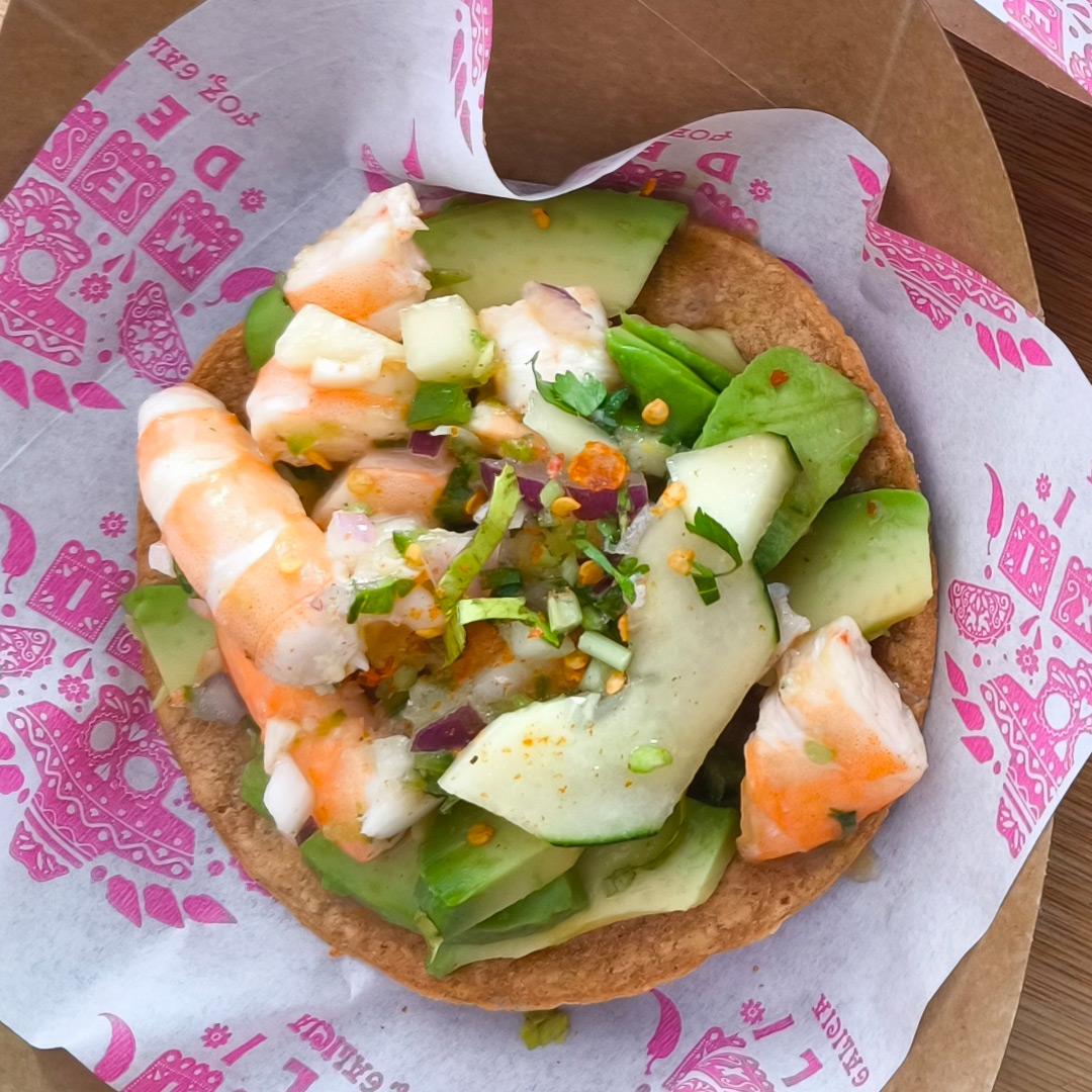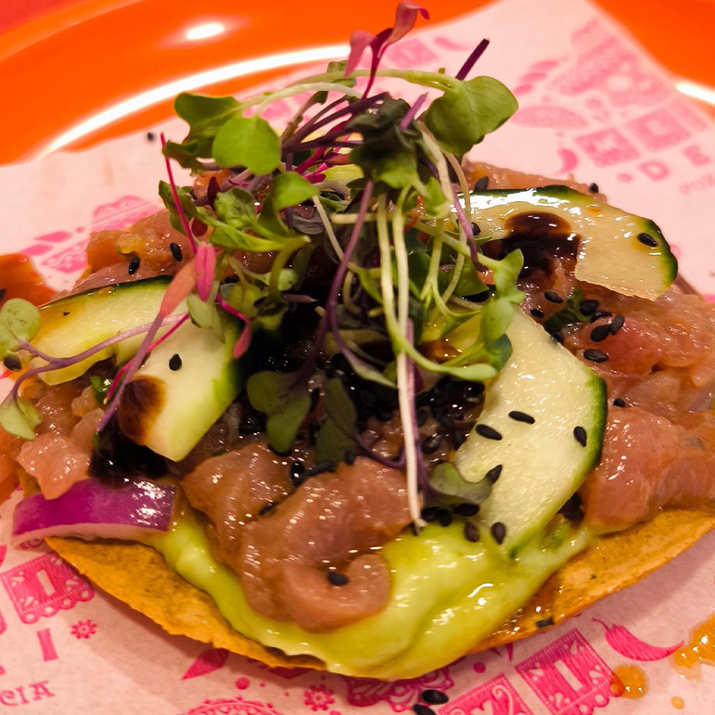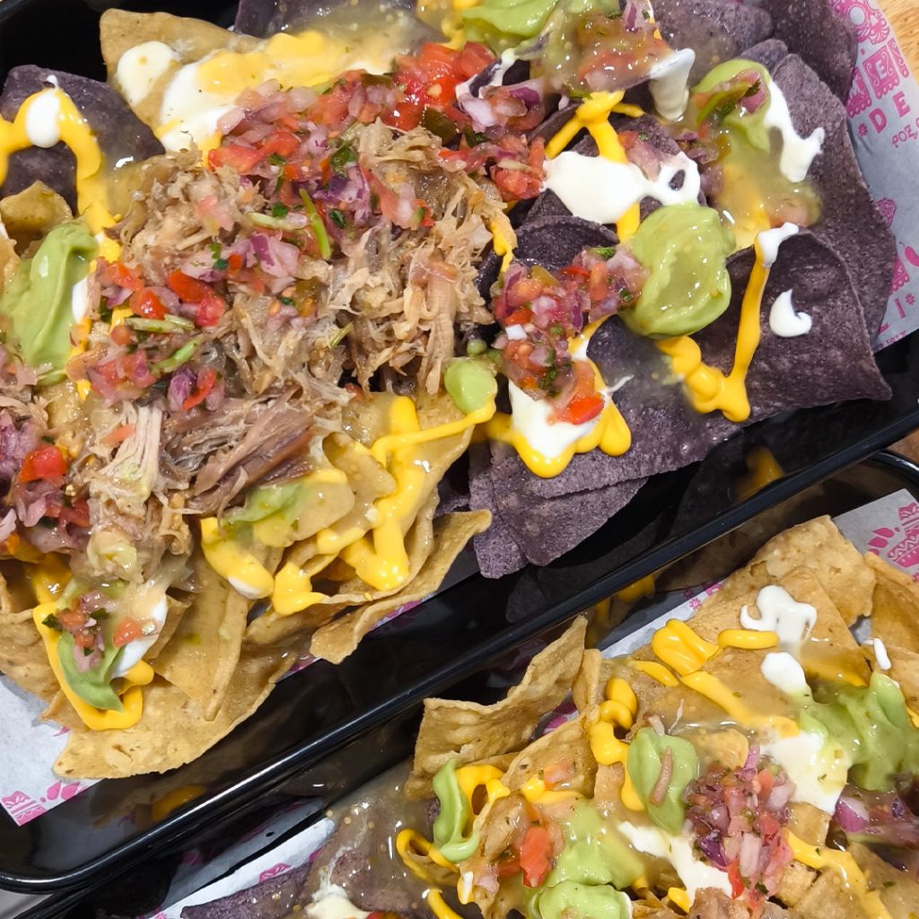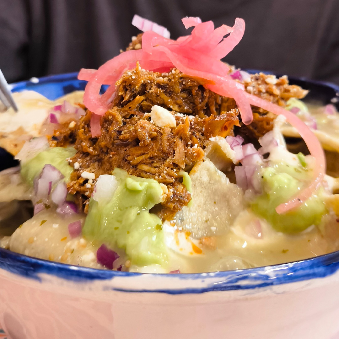 Aperitivo mexicano de totopos (triángulos de tortilla de maíz 100% fritos) cubiertos con queso cheddar, dip de aguacate, pico de gallo (salsa de chile jalapeño encurtido con cilantro, cebolla y tomate), crema ácida, salsa verde y uno de de nuestros 4 rellenos (proteína) a escoger: Carnitas, Cochinita Pibil, Tinga Poblana ó Mole Mexideli.