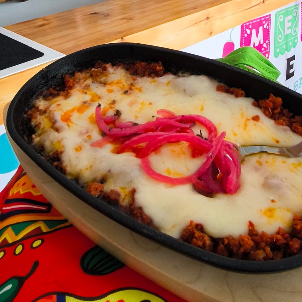 Queso mozarella fundido con chorizo gallego sobre una plancha de hierro caliente, servido con 5 tortillas de harina de trigo y salsa pico de gallo. Ideal para hacer tus propios tacos, también se puede sustituir el chorizo por alguno de nuestros 4 rellenos (proteína), a seleccionar: Carnitas, Cochinita Pibil, Tinga Poblana ó Mole Mexideli.