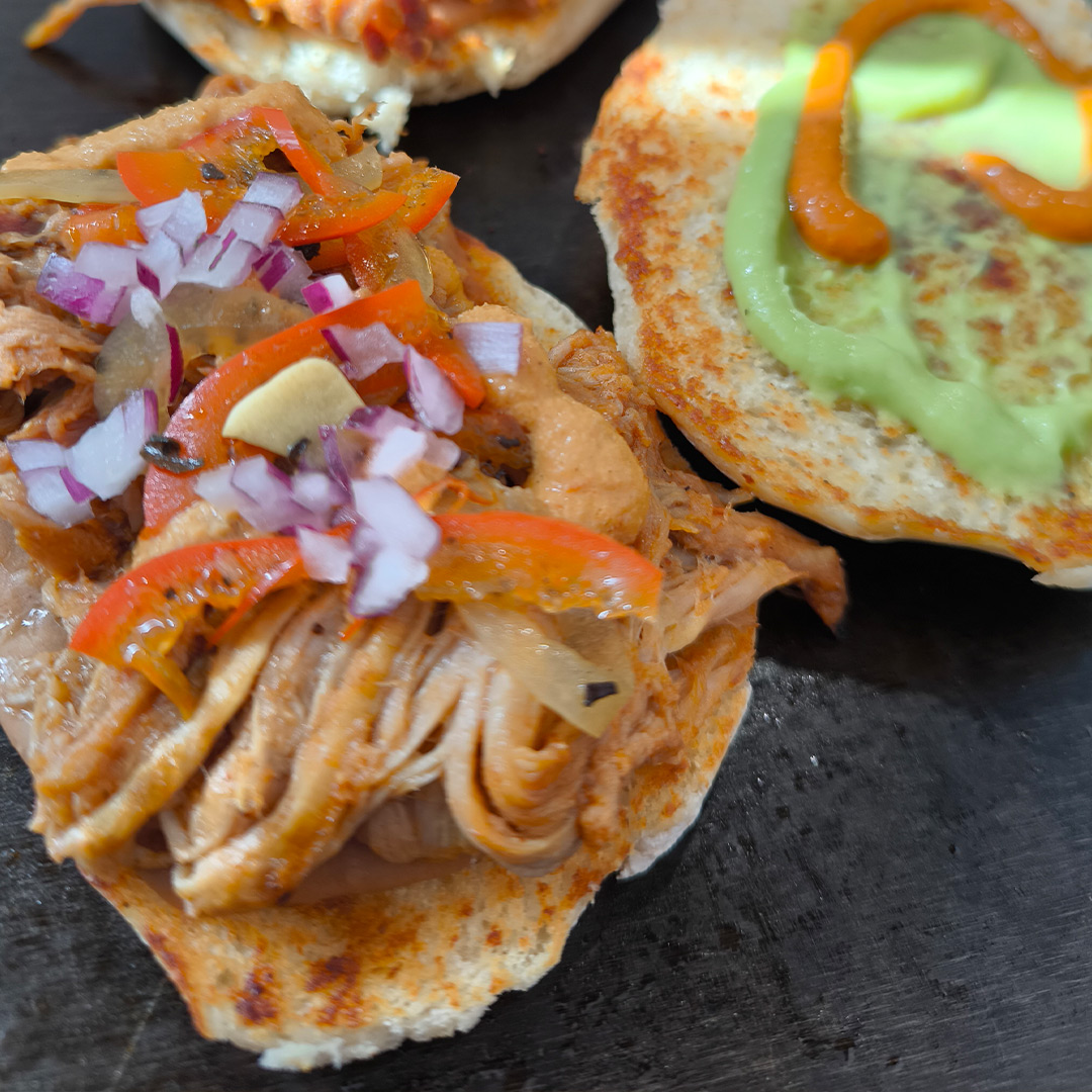 Es un tipo de sándwich hecho con un pan de mollete andaluz que traemos de Antequera/Málaga, se dora y untamos una pasta de frijoles (alubias) con chile guajillo (no picante), dip de aguacate y uno de de nuestros 4 rellenos (proteína) a escoger: Carnitas, Cochinita Pibil, Tinga Poblana ó Mole Mexideli.