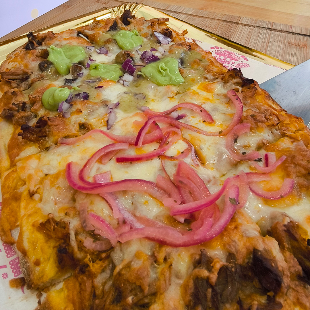 La pinsa romana es una base horneada que traemos de Italia, similar a la pizza pero con una masa hecha de mezcla de tres harinas (trigo, soja y arroz), una alta hidratación y una larga fermentación de hasta 72 horas. Su nombre proviene del latín "pinsere", que significa estirar, y se caracteriza por su forma ovalada, corteza crujiente, interior ligero y esponjoso, y es más digerible que la pizza tradicional, la cual hacemos a la mexicana untando una base de pasta de frijoles (alubias) con chile guajillo (no picante), queso mozzarella a seleccionar uno de de nuestros 4 rellenos (proteína) y gratinamos en horno: Carnitas, Cochinita Pibil, Tinga Poblana ó Mole Mexideli.