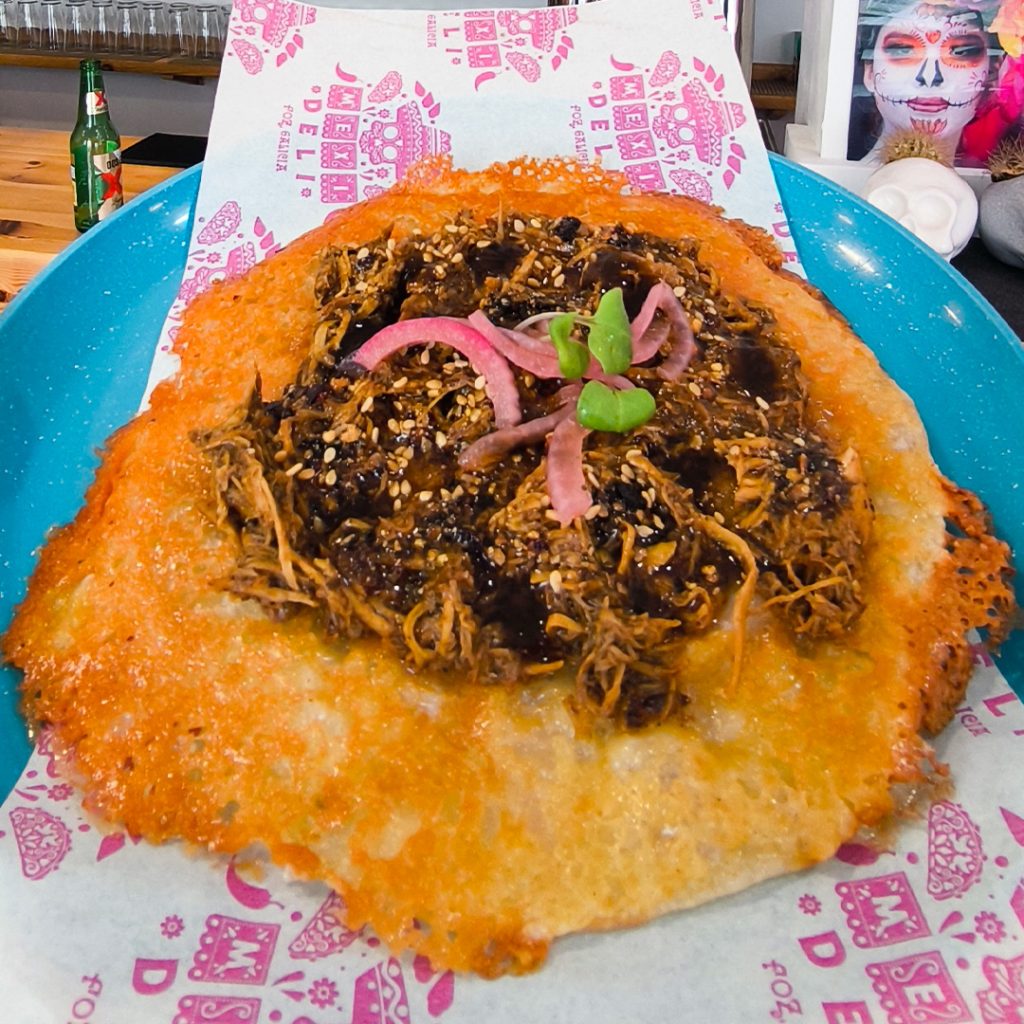 Tortilla de maíz 100% (sin gluten) calentada en plancha con una costra de queso mozarella que contiene uno de nuestros 4 rellenos (proteína): Carnitas, Cochinita Pibil, Tinga Poblana ó Mole Mexideli.