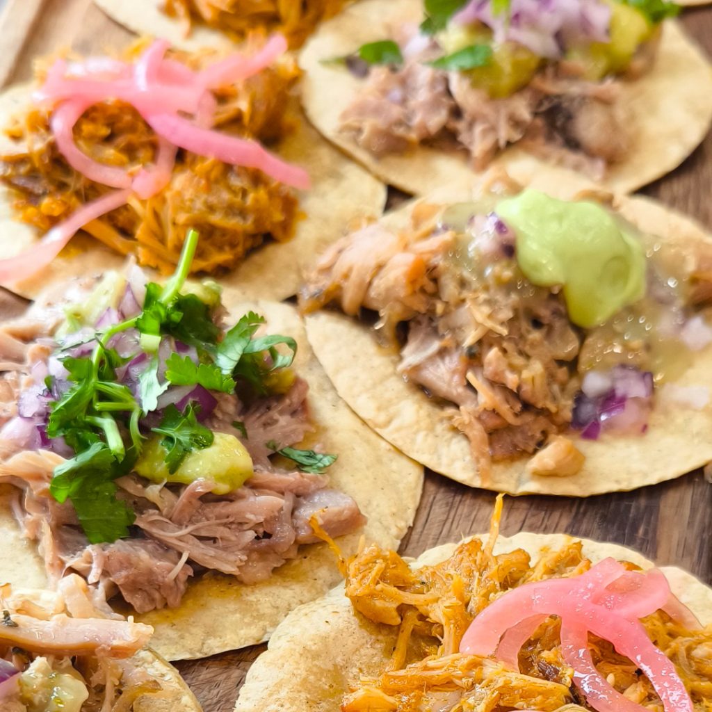 Carne de cerdo confitada lentamente en su propia manteca con naranja, canela, comino, laurel entre otras especias hasta quedar tierna, dorada y jugosa. Se sirve con salsa verde (no picante), cilantro, lima y cebolla morada picada finamente.