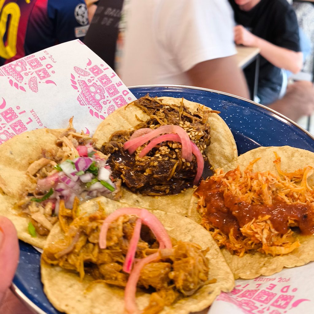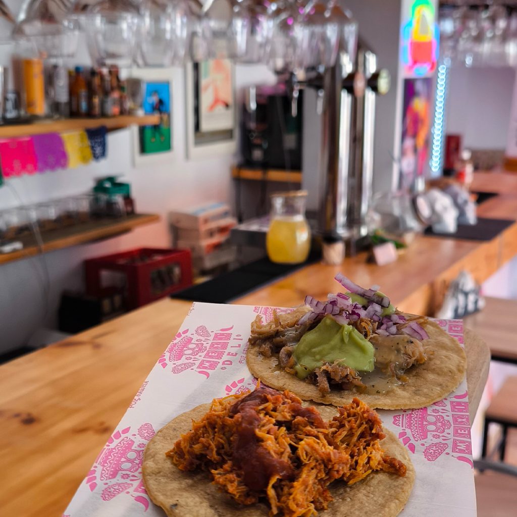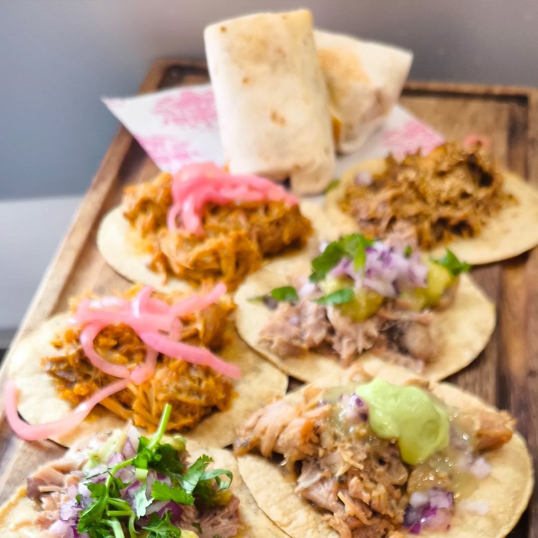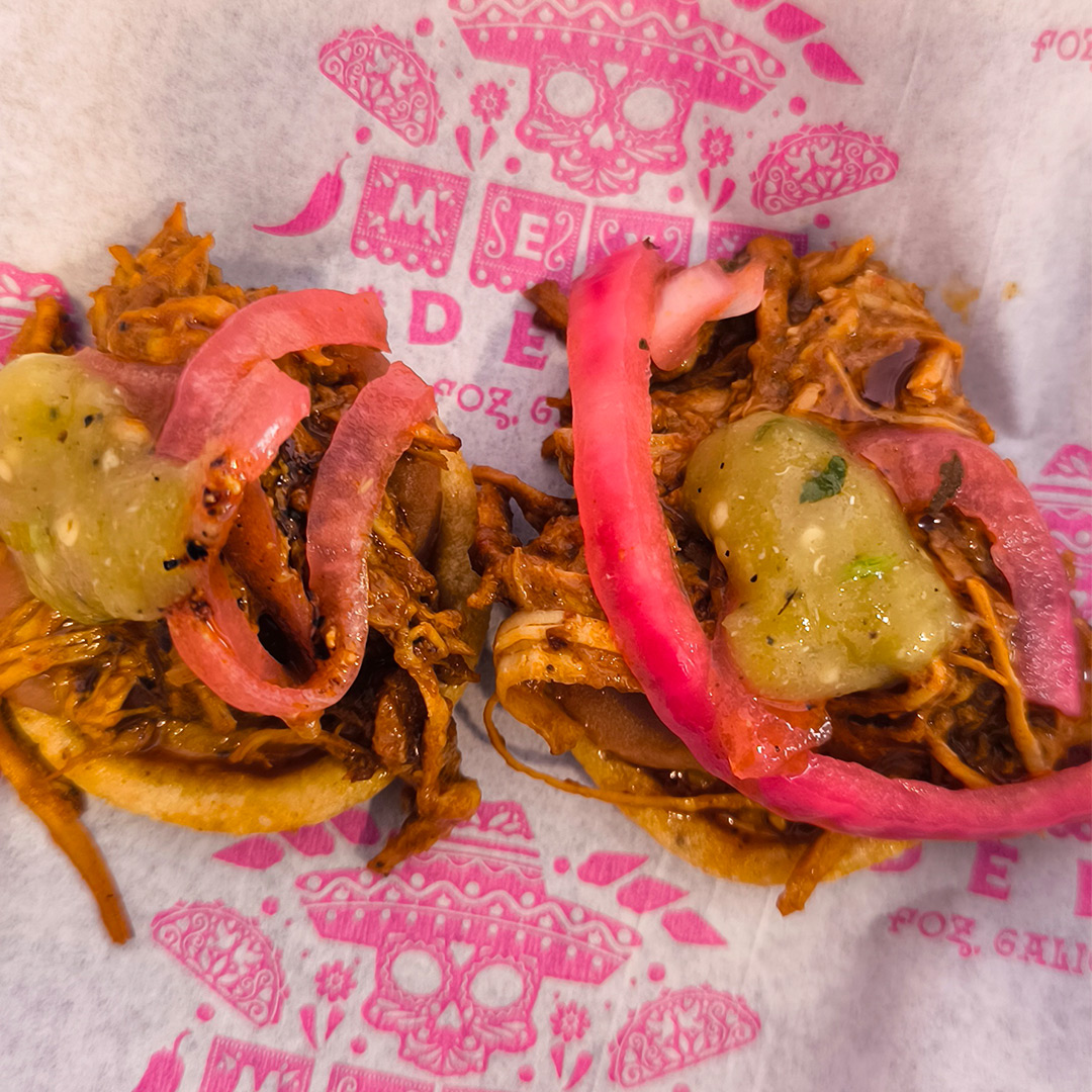 Tortilla de maíz 100% (sin gluten) calentada en plancha y doblada que contiene uno de nuestros 4 rellenos (proteína): Carnitas, Cochinita Pibil, Tinga Poblana ó Mole Mexideli.